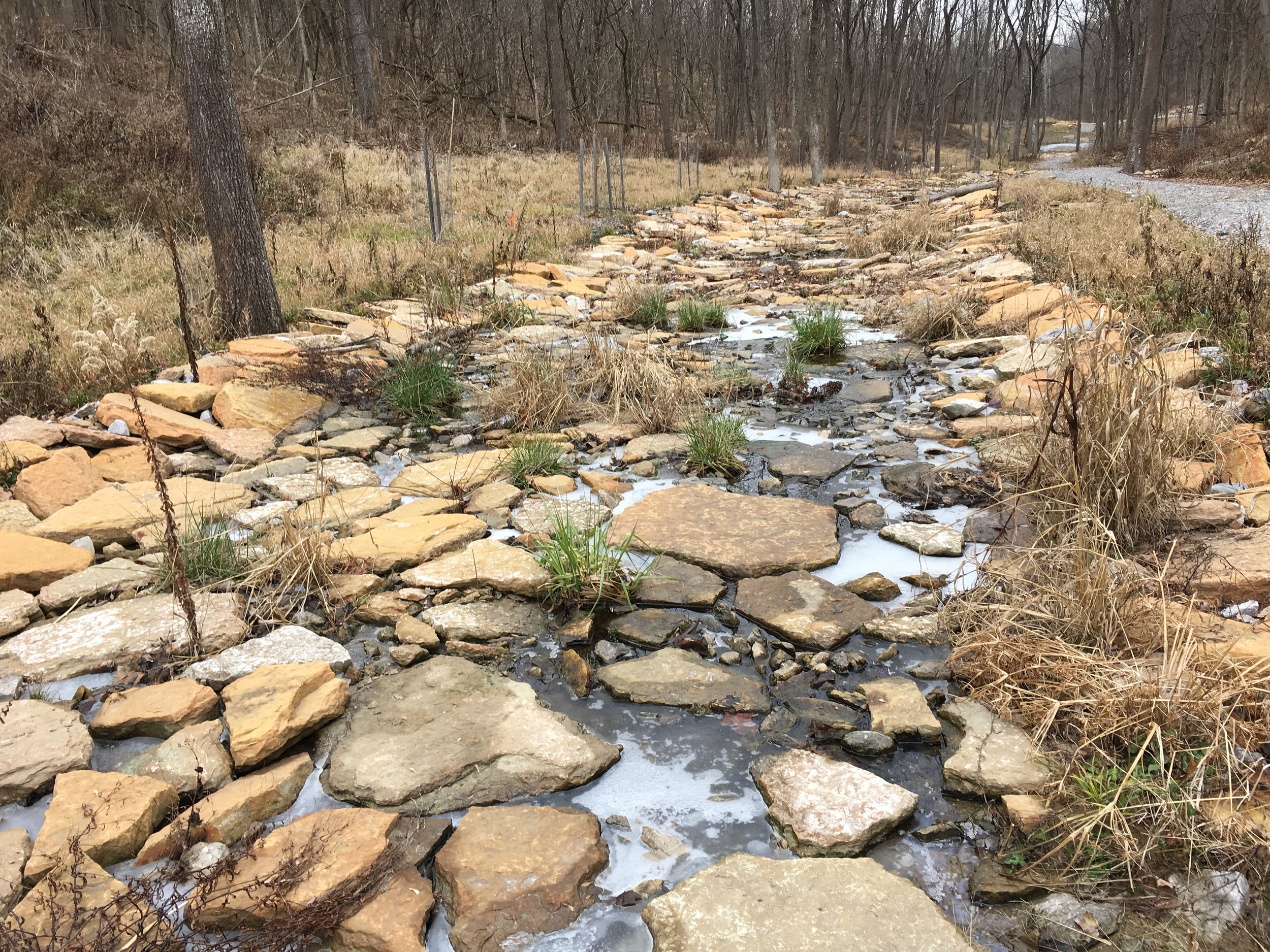 ~3,200 feet of daylighted stream in a nature preserve with native limestone “creek rock” revives a stream that had been buried in a combined sewer for more than 100 years.